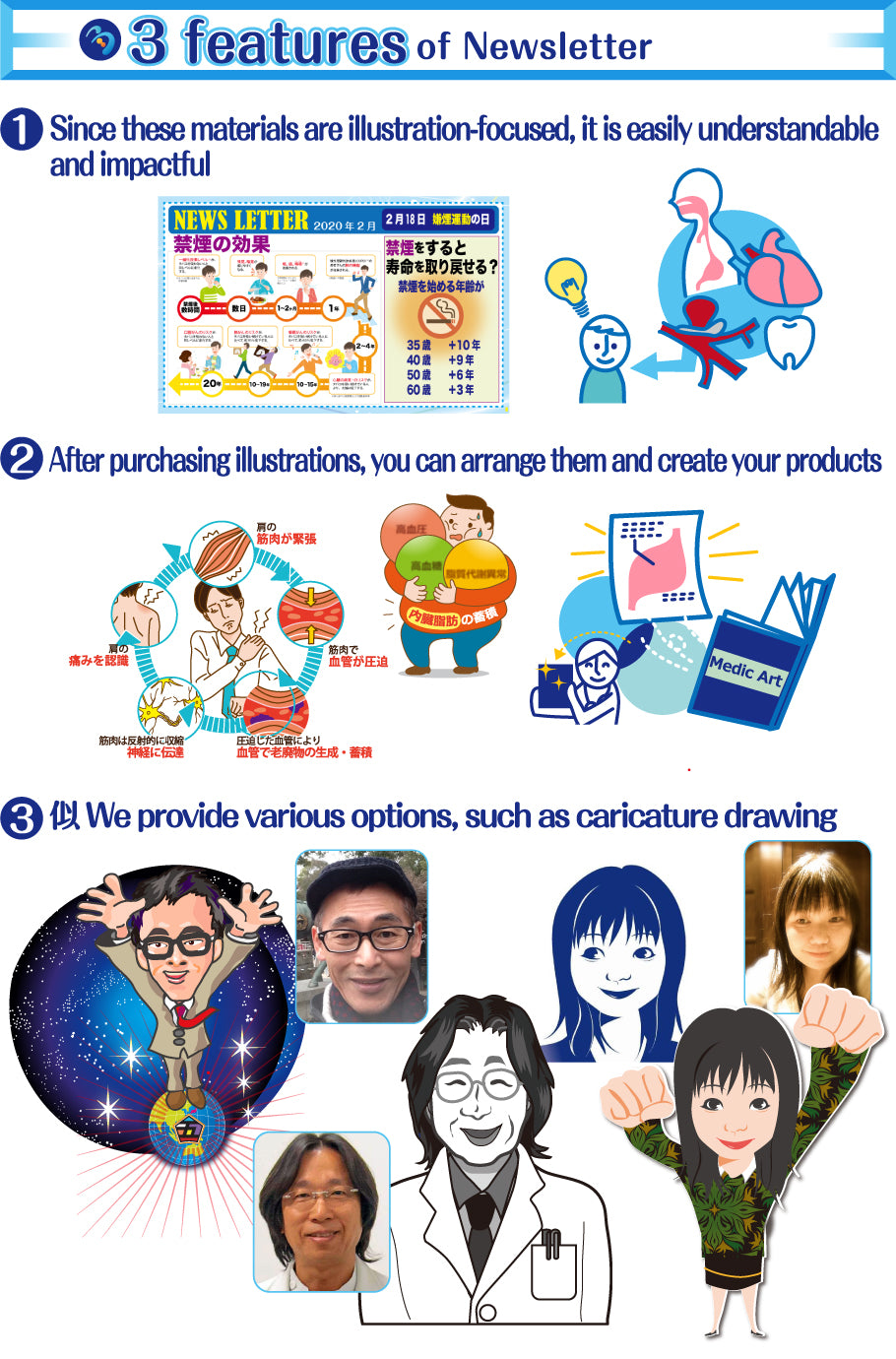 These materials are sold only in Japanese. Only illustrations for newsletter articles are sold overseas.We provide “completed version of newsletters” and “illustrations for articles” for those who want to make arrangements. Please understand that a small copyright notice of “Medic Art” is included in these illustrations as they are offered at lower prices than the normal prices. The completed version of newsletters is only available in Japanese. About sales of “illustrations for newsletter articles”The illustrations for newsletter articles are provided in medium size with a long side of 1280 or 640 pixels.