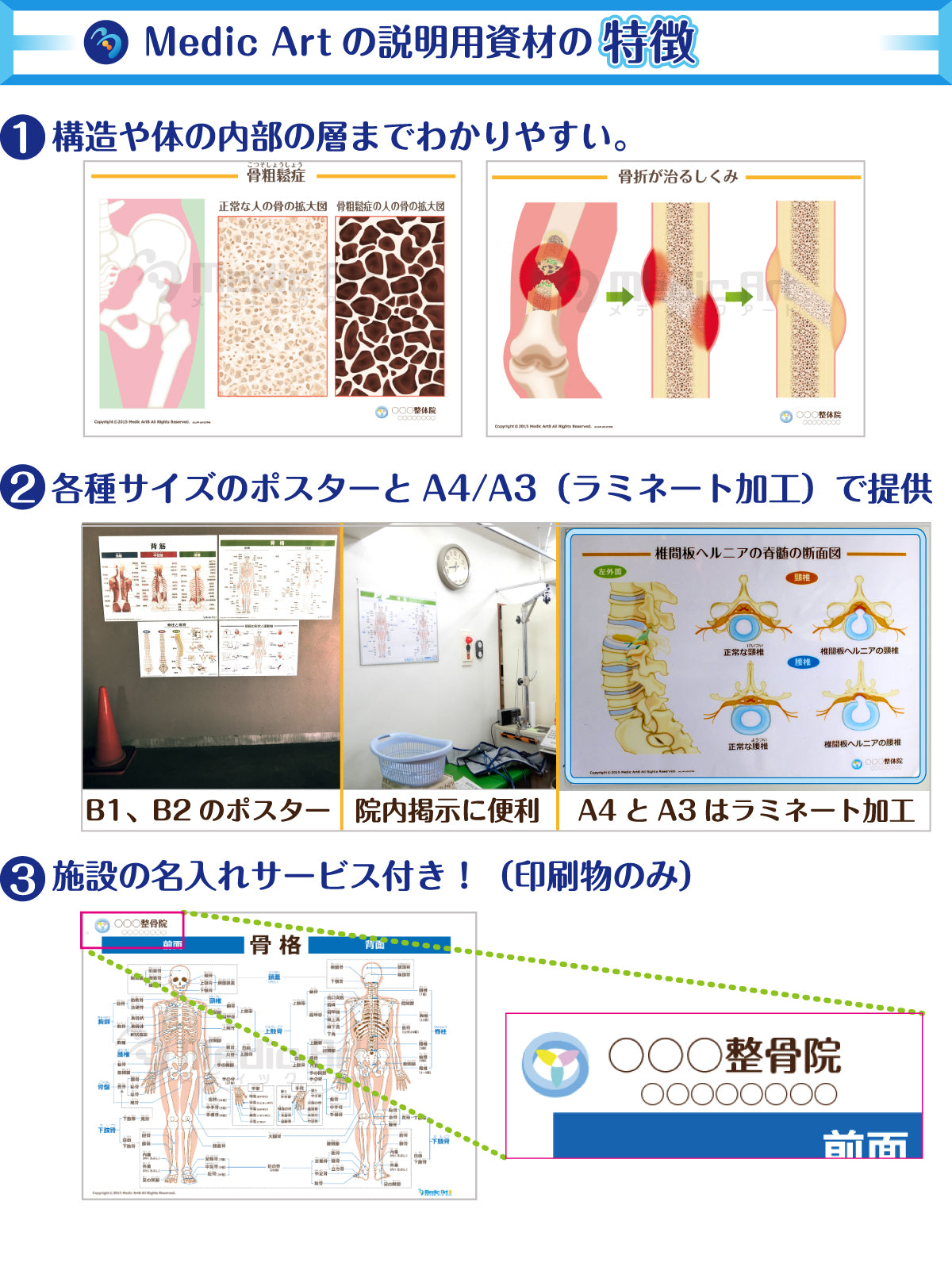 Medic Artの説明用資材は、イラストをメインに患者さんに説明しやすいように要点を最小限に記載する形で、 視覚的に理解できるようにまとめたシートになります。データでの販売、印刷物での販売がございます。 データ販売は、A4サイズのJPEG 画像を取り扱っています。説明用資材のデータ販売は、イラストに Medic Art の著作権表記をさせていただき、個別でイラストを購入するよりもお安く提供させていただいております。 著作権表記を外したい場合は、問い合わせからご連絡ください。 印刷物の販売は、A4とA3 とポスターで行っています。印刷物の販売のみ施設の名入れサービスをいたします。 A4 と A3 はパウチをして郵送でお届けします。ポスターをご希望の場合は、サイズと部数をお伝えください。 また、このようなイラストが欲しいというご希望があれば、問い合わせよりリクエストをしてください。